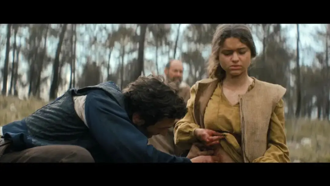 三人途中遭遇难民抢夺马匹,被迫徒步前行,尼洛意识到佩拉的存在可能成为更大的麻烦。