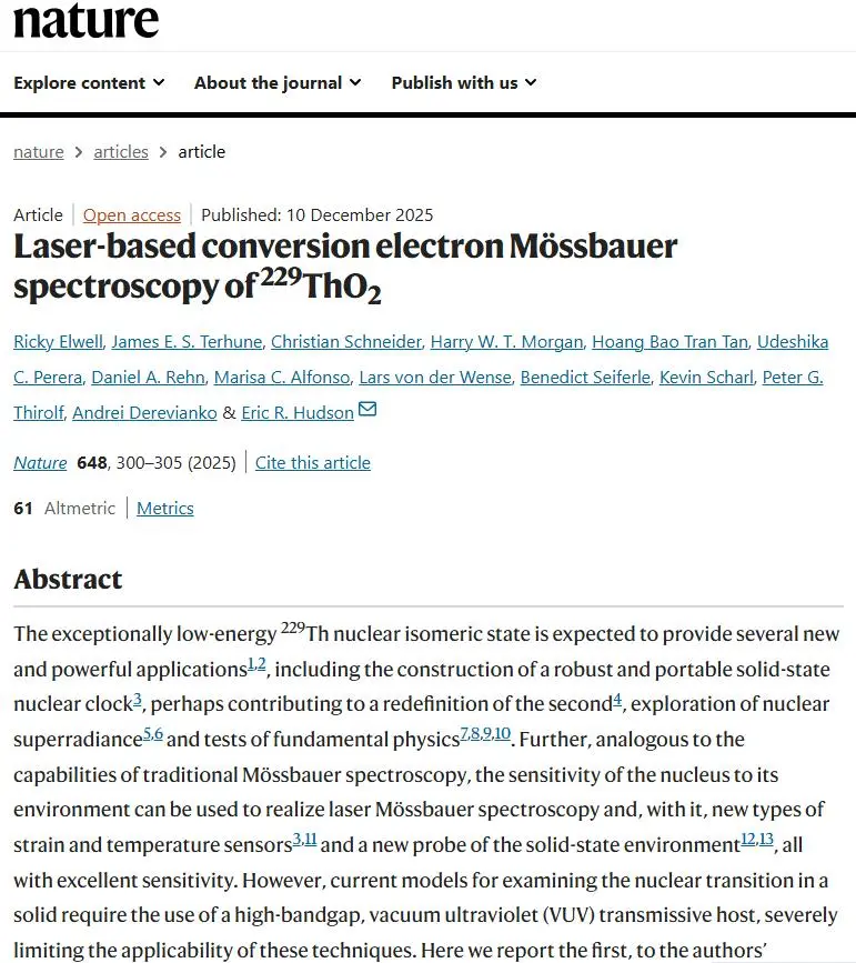 Elwell, R., et al. "Laser-based conversion electron Mössbauer spectroscopy of 229ThO2." Nature, 2025. DOI: 10.1038/s41586-025-09776-4.