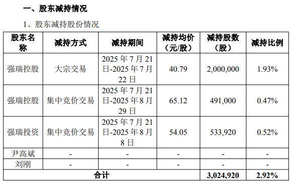 强瑞科技、强瑞投资的上一轮减持发生在2025年7月~8月,合计减持比例为 2.92%,合计减持股份数量为 3,024,920 股,套现约1.42亿元。