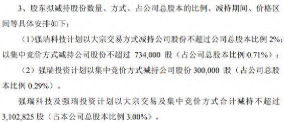 10月10日,强瑞技术(301128)公告,公司的控股股东新余市强瑞科技发展有限公司(由深圳市强瑞投资控股有限公司更名而来),及其一致行动人泰安市强瑞创业投资合伙企业(有限合伙),计划在十五个交易日后的三个月内(即2025年11月3日至2026年2月2日),以集中竞价方式及大宗交易方式合计减持公司股份不超过310.28万股(占公司总股本比例3.00%)。