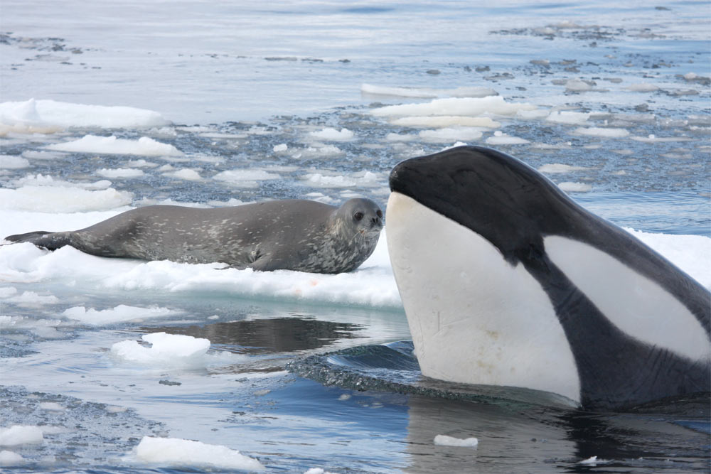 首先,它们会先确定海豹的位置,在水里它们是能感知到的,若海豹是在浮冰或者其他物体之上时,虎鲸则会把身体直立,脑袋探出水面来确定目标。