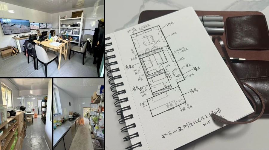 推门即为工作区,约20平方米,中央摆两张书桌、六把椅子,沿墙除两扇窗外,设有一大三小屏幕、货架、监控存储柜、两台光伏发电逆变器及文件柜,这里是监测主阵地。往里进入生活区,走廊与两间宿舍,分别约10平方米和7平方米,各有两个上下床铺分列两侧;沿走廊排列着橱柜、货架和餐桌,直通厨房。厨房内,冰箱与冰柜并列,配有食材货架、不锈钢料理台、罐装燃气灶及排风扇,地面上的大钢盆用于洗菜洗碗。