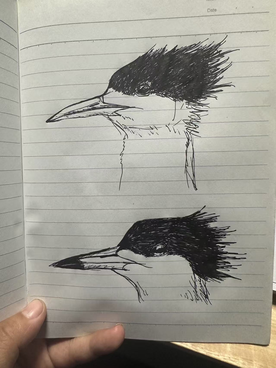 魏宇宁手绘的大凤头燕鸥(上)与中华凤头燕鸥(下)之间的区别。最大的区别就是后者的喙尖是黑色。