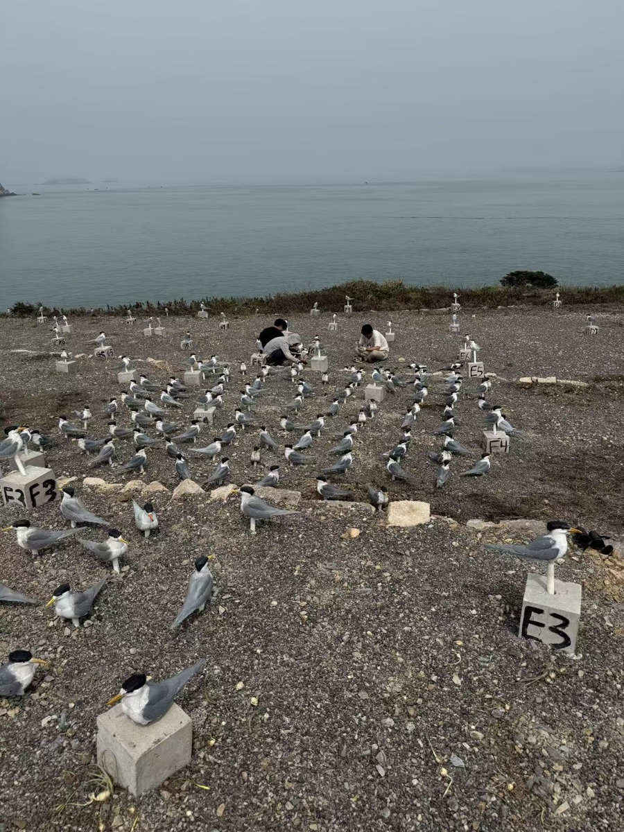 韩旭坤每天的工作与魏宇宁基本相同,唯一不同的是他驻扎在平峙岛,在岛上就能直接监测燕鸥。平峙岛是温州平阳南麂列岛中的一个小岛,南麂列岛是国家级海洋自然保护区,也是联合国教科文组织世界生物圈保护区网络成员和国际重要湿地,从2023年开始招引燕鸥,这里也是燕鸥的重要繁殖地之一。
