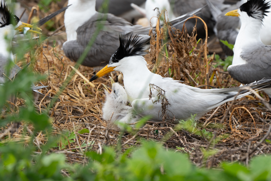 5月中旬的一天,已经驻岛一个多月的魏宇宁和伙伴们欢呼起来,她在实时监控里发现,几千只大凤头燕鸥里面有两只中华凤头燕鸥跳起了求偶舞,雄鸟脖颈微扬,展开覆着细密白羽的双翼,翅尖轻掠地面,围着雌鸟一圈圈翩跹旋转,时而俯身低飞,时而昂首振翅,每一个动作都透着笨拙又虔诚的欢喜。雌鸟则静静伫立,时不时歪头轻啄雄鸟,似是回应这份热忱。在这两小只身旁,几千只燕鸥在砂石上引吭高歌,在碧海晴空的映衬下,壮观动人。