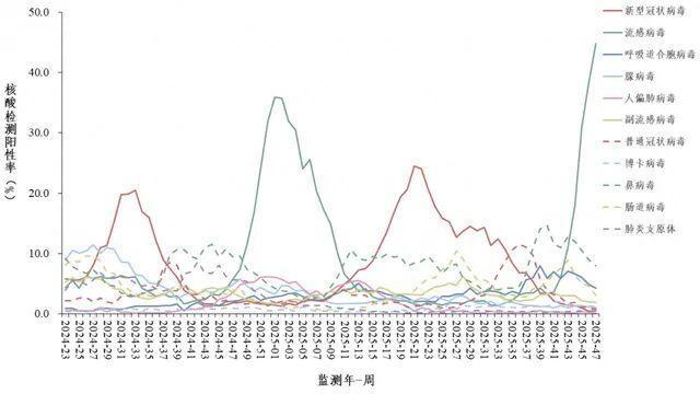哨点医院门急诊流感样病例呼吸道样本病原体核酸检测阳性率每周变化趋势。《全国急性呼吸道传染病哨点监测情况(2025年第47周)》图